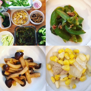 前菜はラディッシュの甘酢漬け、しめじのしぐれ煮、春菊のお浸し、ピーマンのおかか和え、コーン・ツナ・玉ねぎの炒め物です。メインはワンプレートでお子様ランチ風に、煮込み豆腐ハンバーグをサーブしました。そしてデザートには、オトモダチがグルテンフリーのキャロットケーキを持ってきてくれましたョ。とっても美味しかったです (o^o^o)あ(o^-^o)り(o^o^o) が(o^O^o)と(o^.^o)う