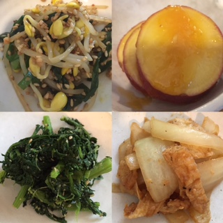 豆もやしとニラのナムル、さつまいものオレンジ煮、玉ねぎとお揚げの味噌炒め、春菊のからしごま和えです。