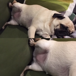 この日も、なんだかよくわからない寝相です。ナナさん、ソファを足で押しながら寝るのが良いようです。