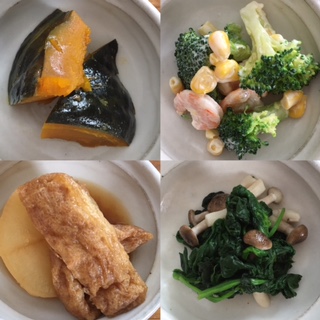 週末はかぼちゃの煮物、ブロッコリーと海老のサラダ、ほうれん草としめじのお浸し、大根とお揚げの煮物を作り置きしました。(