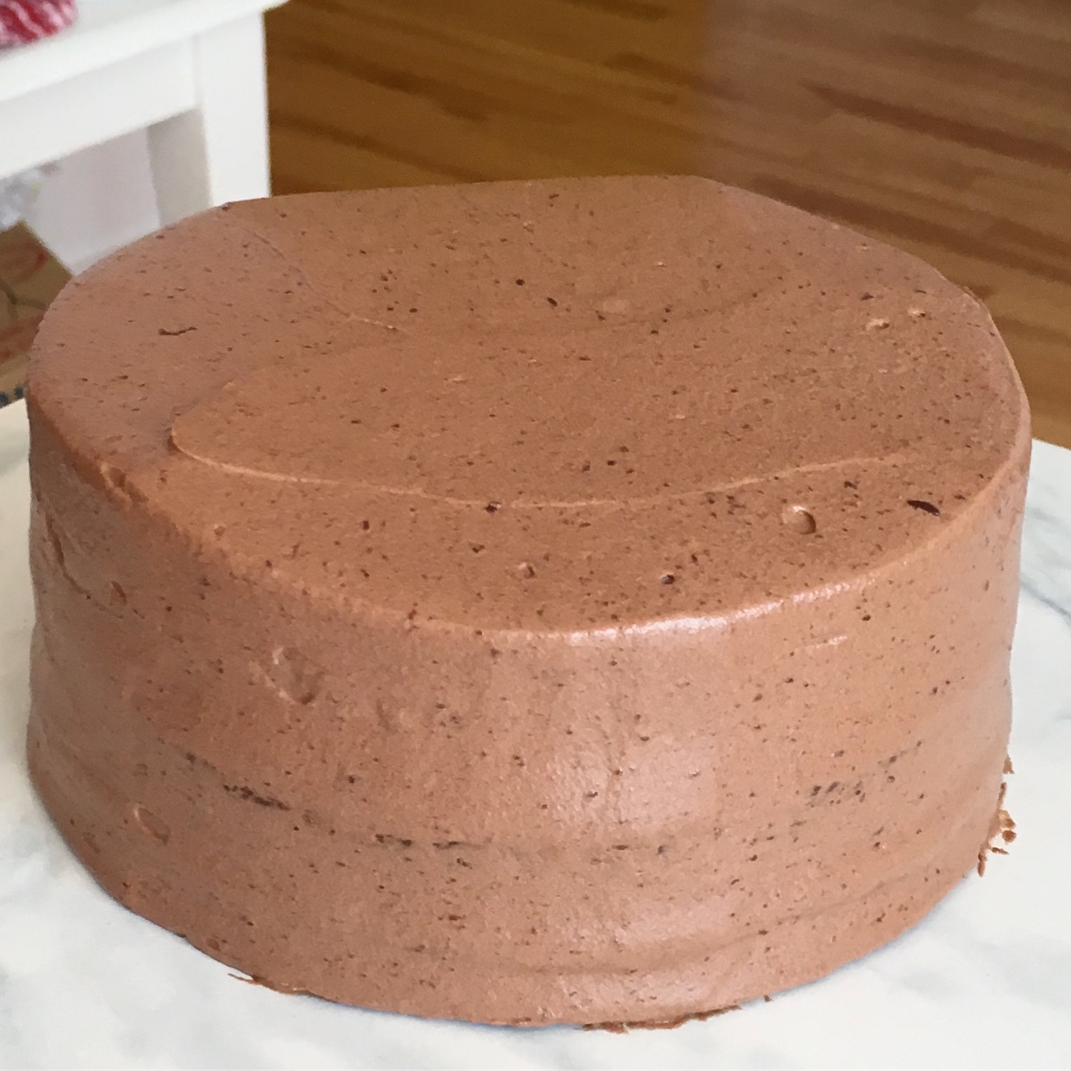 気を取り直して、ふたつのぺちゃんこスポンジをカットし、4段重ねのフォレノワールができました。(レシピよりも巨大なケーキができあがってしまい)チョコレートクリームが最終的には足りず、ナッペもガタガタですが、自宅復習1回目にしては良くできたかな???