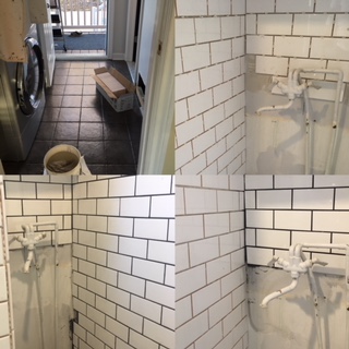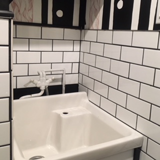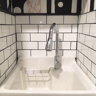 古いシンクを取り外して壁側面にタイルを張り、ダークカラーのグラウトで仕上げます。