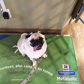 それでは、受付での体重測定です。2週間のダイエットのおかげか???ナナさんの体重は18.8lbs = 8.5kgに!8.8kgより300gの減量です。(