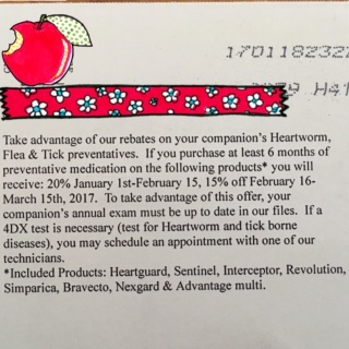獣医さんより、1月1日から2月15日は期間限定でフィラリア、ノミ、マダニの予防薬が20%オフになるとお葉書が届きました O(≧▽≦)O ワーイ♪