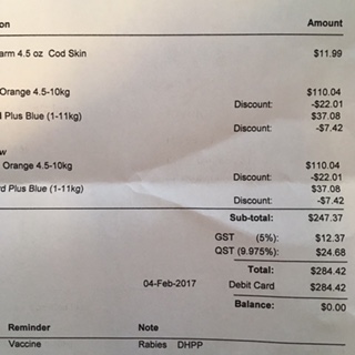 ナナ&ジャズ用に鱈のおやつ、フィラリア予防薬半年分(x 2匹)、ノミ&マダニ駆除薬半年分(x 2匹)を購入し、合計284ドル(25,000円ほど)でした。20%オフですが、相変わらずお高いです。(
