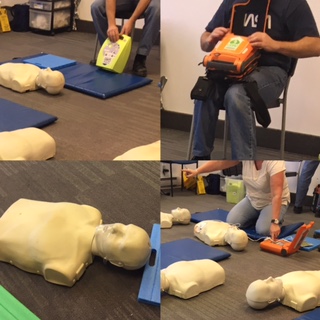 マネキンを使った心臓マッサージ&人工呼吸の練習、AEDの使い方講習、アナフィラキシーショック時のエピペンの使い方、打撲・捻挫・骨折時の手当ての仕方、凍傷・熱射病時の手当ての仕方、糖尿病患者さんへの手当ての仕方、包帯の巻き方、酸素マスクの使い方などなど、内容は盛りだくさんです。