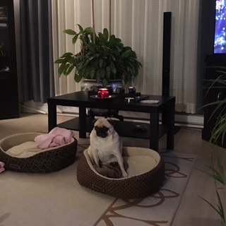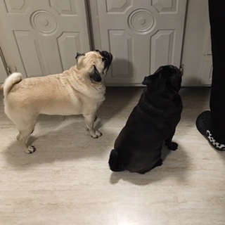 残念ながらこの日は一緒に帰ることができませんので、お義母さんがおやつを見せながら別部屋へおパグさんたちを誘導しようとしました。