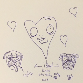 ブーケに添えられたカードには、隅っこにおパグさんたちを描いてくれました。実物よりもイマイチな出来上がりになってしまったらしいですが、なかなか特徴をつかんでいると思います。