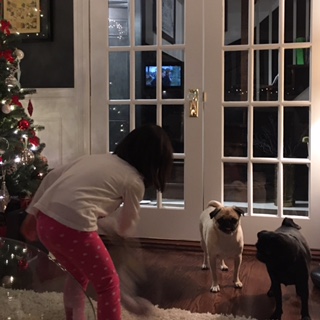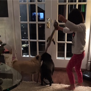 帰国前夜には、おもちゃを使っておパグさんたちと遊ぶことができるようになった誇らしげな姪っ子1号ちゃん。