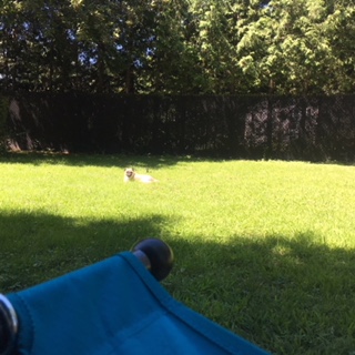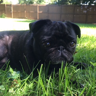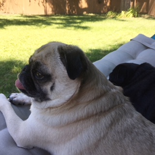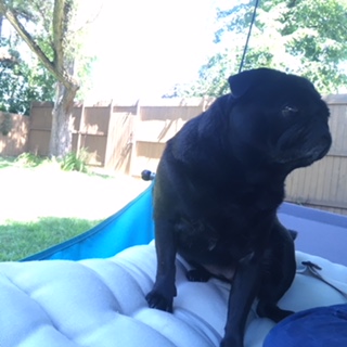 いつもはバックヤードのハンモックに見向きもしないおパグさん。(