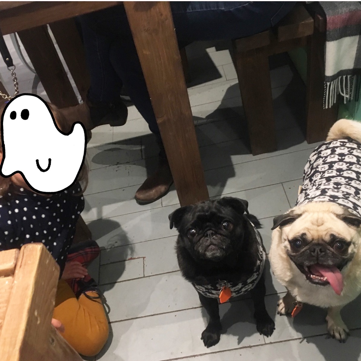 無法地帯です。飼い主たちのテーブル側にずっとステイしているダックスさんがいるかと思えば、大型犬のわんちゃんがやって来ては飼い主たちの食事を狙おうとします。ナナさんも自由自在に歩き回り、ソファ席のおねえさんにずっと可愛がってもらっておりました。