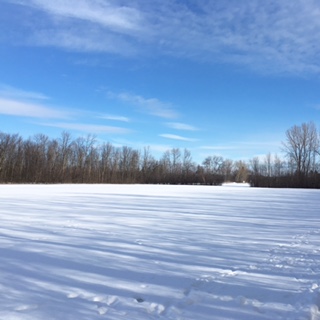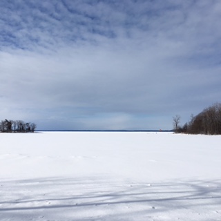 小屋からしばらく進むと壮大なビーチが開けてきます。(このお写真は水が凍っている状態です)公園の3/4は水に面しているそうです。